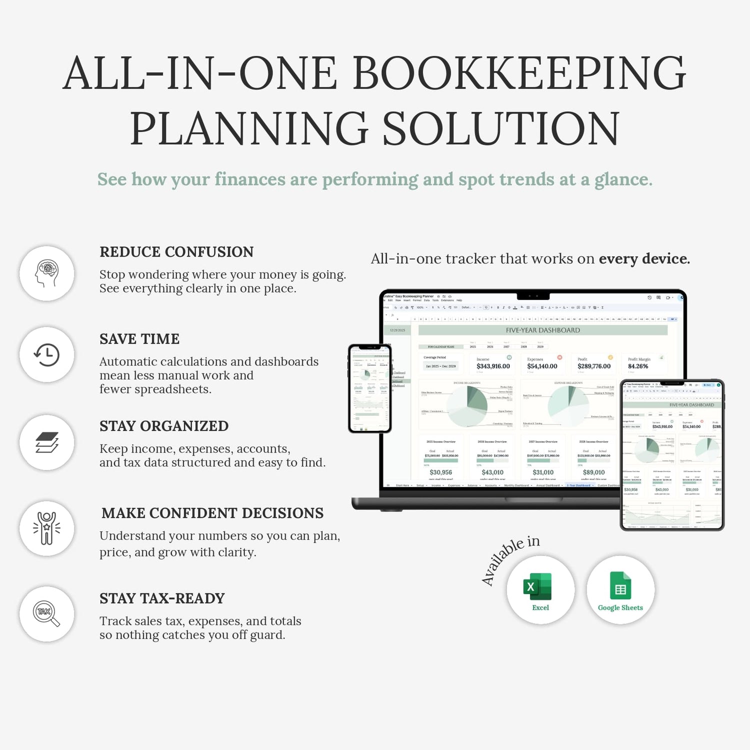 The Easy Bookkeeping Planner keeps everything in one place, updates automatically, and makes it easier to see how your business is doing — without the constant back-and-forth.
